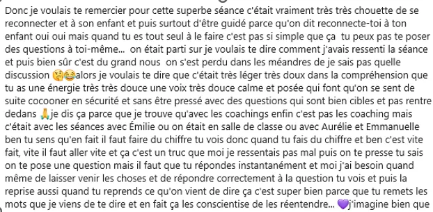 Les séances sont individuelles et se font en visio (Zoom ou Whatsapp), dans un espace confidentiel et bienveillant où chaque échange dure 1h à 1h15, en général du lundi au vendredi en journée.