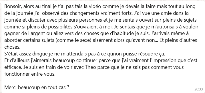 Je comprends ce que tu ressens. J'étais exactement à ta place il y a quelques années : j'avais conscience de mes blocages et je sentais que ma vie tournait en boucle, mais l’idée de m’engager et d'investir sur moi me faisait peur.